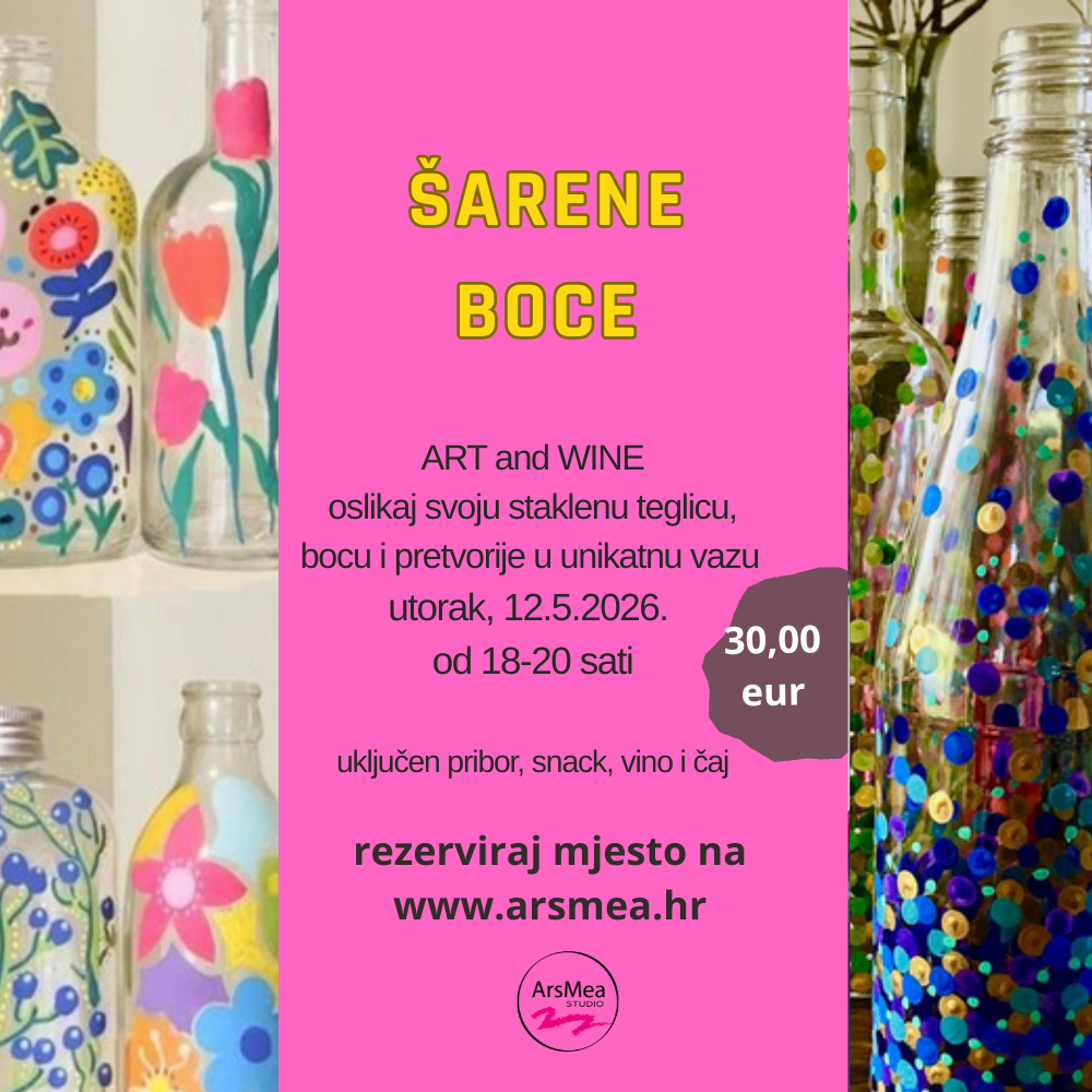 U ovoj radionici oslikavamo staklene boce, staklenke raznih veličina i oblika. Svatko od polaznika moći će izabrati jednu staklenu posudu između ponuđenih oblika, a u radionicu je uključen sav pribor, vino, snack i čaj po želji.
