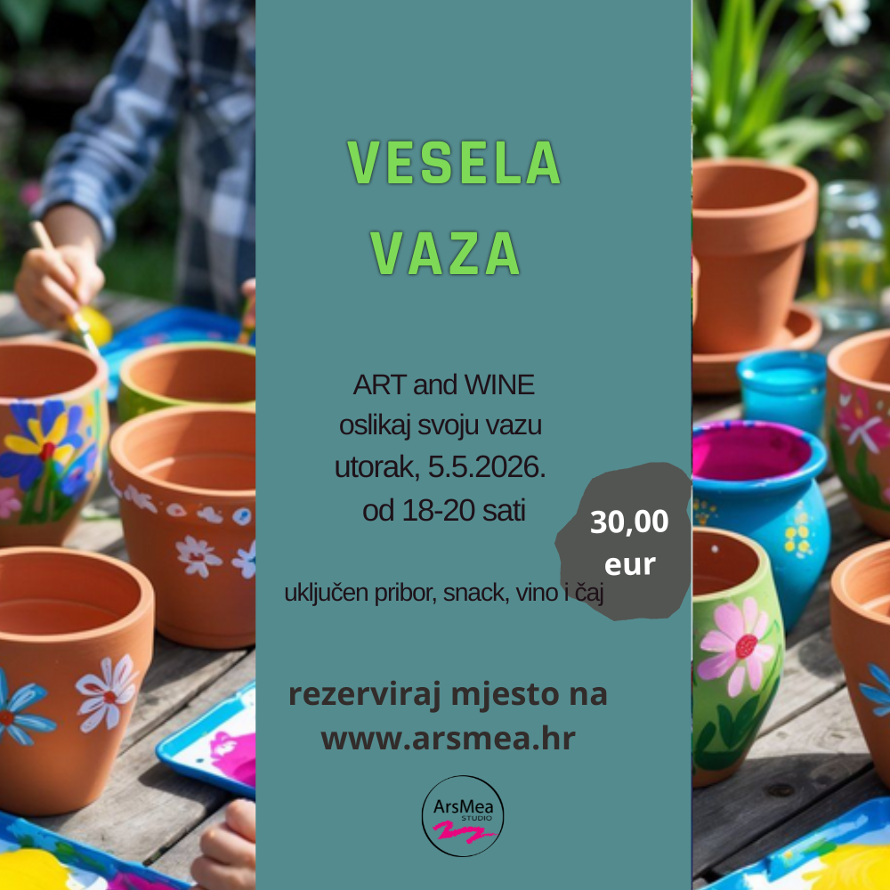 U ovoj radionici oslikavamo vazu akrilnim bojama i posebnim akrilnim flomasterima , te bojama za kamen. Svatko od polaznika moći će izabrati jednu vazu između ponuđenih oblika, a u radionicu je uključen sav pribor, vino, snack i čaj po želji.